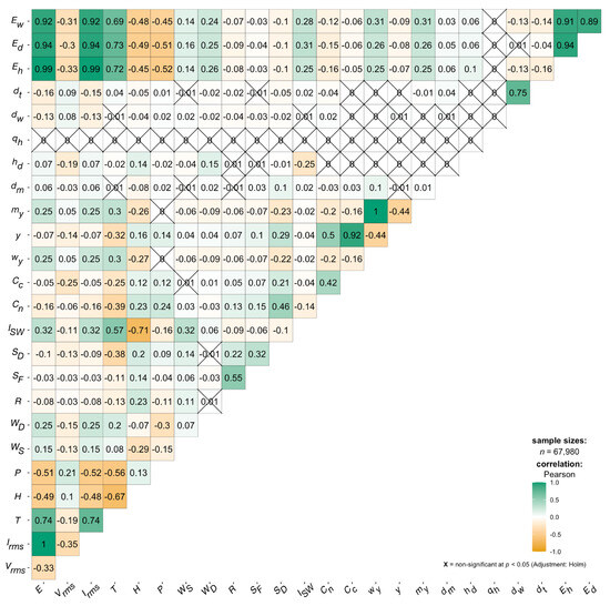Furthermore, Figure 3 visualizes a correlogram regarding the input variables of the data set utilized in the context of this study according to Pearson’s correlation such that each cell of the correlation matrix in Figure 3 corresponds to a coefficient value among −1.0 and +1.0 in order to analyze and determine the linear correlation of two variables. Basically, two variables are either highly similar near +1.0, uncorrelated near zero, or correlated inversely near −1.0. The formula of the Pearson Correlation Coefficient (PCC) is given as follows,