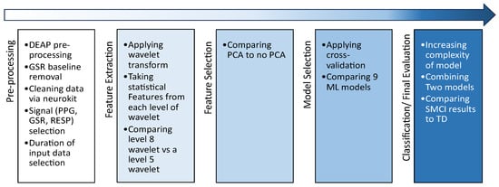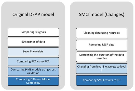 The same experimental protocol used for the DEAP dataset could not be replicated with participants who had SMCIs. Changes in the data collection were required and the duration of the trials was reduced. As a result, the DEAP model had to be modified to account for these differences (Figure 2). The following changes to the DEAP model were implemented (and are further discussed): the removal of the RESP signal, the cleaning of the BDAT data was required using Neurokit (version 2), modifying the duration of the data samples (the BDAT data was only collected for 6 s, while the DEAP data was collected for 60 s), and the use of level 5 wavelets instead of the level 8 wavelets. Instead of looking at the various model complexities with different categories, the nine categories were evaluated and the emotion word from the detected physiological signals was compared to the DEAP equivalent.