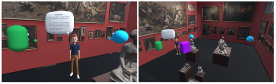 We implemented two versions of a virtual guide system—synchronous and asynchronous. Both versions share common logic for the delivery of contextual information about points of interest (POIs) through a JSON-based data retrieval mechanism. This JSON file, parsed using Unity’s JsonUtility, contains relevant details such as historical facts, names, and multimedia links. The data are displayed in real time through a speech bubble above the guide’s head, implemented with Unity’s Canvas system (Figure 4, left). This provides an interactive and educational experience while maintaining smooth and engaging communication.
