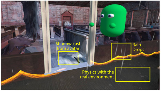 Six weather conditions were modeled to demonstrate the environmental adaptability of the application: clear sky, drizzle, rain, thunderstorm, clouds, and mist. Each condition is visually represented using Unity’s particle systems, optimized for low-resource usage on mobile devices. Rain types use simple, low-polygon raindrop effects, and mist is a combination of image-based fog and low-density particles used to simulate atmospheric diffusion, ensuring that each weather type is rendered with performance efficiency in mind. For the light direction estimation, we used a sun direction calculation based on the user’s location, and the light intensity is derived from the weather conditions [24] and then applied to the virtual scene’s directional light (Figure 3).