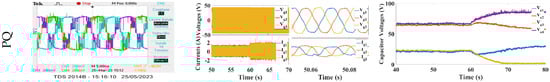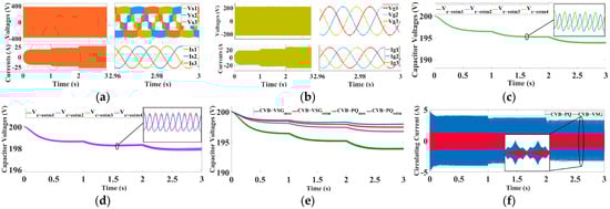 Figure 8a and Figure 9a depict the steady-state waveforms of the MMC output voltage. It is evident that the waveform exhibits improved characteristics when utilizing the CVB-PQ and CVB-VSG control strategies (Figure 9a), where five balanced and stable levels are observed. In contrast, the PQ and VSG strategies (Figure 8a) result in unstable and unbalanced voltage levels, leading to the disappearance of internal levels.