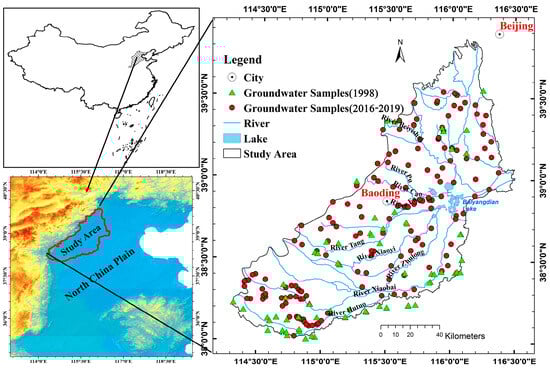 Location of the study area and distribution of the groundwater samples. The nitrate data are cited from the work of Feng et al. [33].