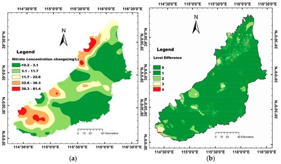 Nitrate concentration changes from 1998 to 2018 and level difference maps for: (a) nitrate concentration changes; (b) level difference.