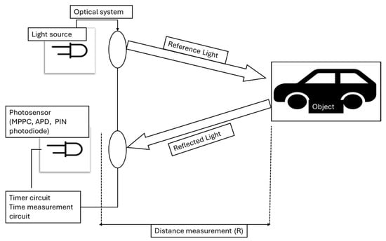 LIDAR operates by emitting a pulse of light in the infrared (IR) or near-infrared (NIR) spectrum from a laser diode. The emitted laser beam was split into two separate paths using an optical system: one portion served as reference light, while the other was directed toward the target object. The light reflected from the object’s surface followed the same optical path back to the photodetector, which captured and recorded the detection time and intensity of the returning signal, providing information about the object’s position. Once emitted, the laser pulse propagated for a specific duration (τ), triggering an internal clock within the timing circuit. The time difference ( between the reference light and the reflected signal was then used to accurately determine the object’s distance (R) from the LIDAR sensor using Equation (1) [17]. In this context, the intensity of the laser pulse (which is influenced by surface reflectivity and atmospheric conditions) was modeled using Equation (1). Meanwhile, the distance calculation, based on the time-of-flight (ToF) principle, is formulated in Equation (2) [17].