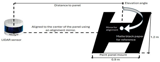 The panels were coated using a manual spraying technique on flat, square nickel-plated mild steel plates. Each panel measured 50 cm × 50 cm, and, for larger surface tests, four panels were combined to create a 1 m × 1 m test surface. These dimensions were selected in accordance with physical constraints, and magnetic stabilizers were utilized to ensure precise panel positioning. During the experiments, the panels were oriented at different angles relative to the LIDAR sensor. Figure 2 illustrates the experimental setup used in this study, where a LiDAR sensor measures the reflectivity of test panels under controlled conditions. A customized mounting system ensures precise alignment and allows for systematic variation of panel angles between 0° and 70° in 5° increments. A digital angle gauge was used to ensure accurate angle adjustments. Additionally, reference surfaces, including matte black paper and a whiteboard, were incorporated to provide comparative reflectivity measurements. An alignment mirror was also utilized to maintain the sensor’s alignment with the center of the panel, ensuring consistency in data collection [6].
