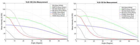 At the final stage of data processing, the datasets comprising angle, distance, and laser intensity values were standardized to contain 85 equally spaced data points for each parameter. This standardization ensured that laser intensity data collected at different distances and angles could be analyzed in a consistent and comparable format. In this study, laser intensity values were examined for four distinct distances: 2.5 m, 5 m, 10 m, and 30 m. At each distance, the influence of surface color on laser intensity was analyzed across incidence angles ranging from 0° to 70°. Figure 3 and Figure 4 illustrate the impact of color and surface characteristics on laser intensity values at these four distances.