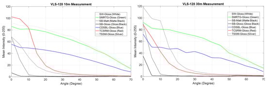 Representation of laser intensity values at distances of 10 and 30 m, depending on different colored surfaces and angle changes between 0–70°.