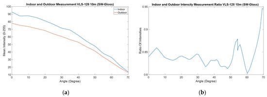 Indoor and outdoor measurement data from this study: (a) Indoor and outdoor laser intensity measurements for SW-Gloss surface at a distance of 10 m. (b) Density ratios between indoor and outdoor measurements for SW-Gloss surface.