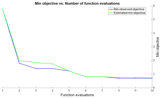 Bayesian optimization is widely recognized as an effective method when evaluating an objective function with a high computational cost. In this process, Expected Improvement (EI) and Upper Confidence Bound (UCB) acquisition functions were employed. EI is designed to select hyperparameters that are most likely to enhance model performance, whereas UCB ensures an optimal trade-off between exploration and exploitation. In this study, a value of K = 2 was chosen for UCB and retained as the default setting in Matlab. This selection provides an optimal balance between reliability and performance. Figure 6 illustrates the minimization of the objective function over multiple iterations in the Bayesian optimization process. In this figure, the blue color denotes the lowest RMSE values obtained through direct observations, while the green color represents the lowest RMSE values estimated by the Bayesian model.