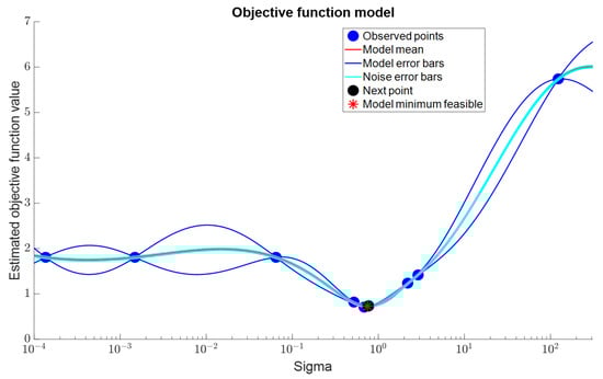 Bayesian optimization effectively identifies uncertain regions in the hyperparameter space and determines optimal solutions for these areas. The graph indicates that, when Sigma is approximately 10−1, the objective function reaches its minimum value. At this point, further improvements in model performance were not observed, and the objective function remained stable. This confirms that Bayesian optimization conducted a sufficiently thorough exploration of the solution space. As a result, the Bayesian optimization process successfully determined the optimal value of Sigma and minimized the objective function, thereby enhancing model performance.