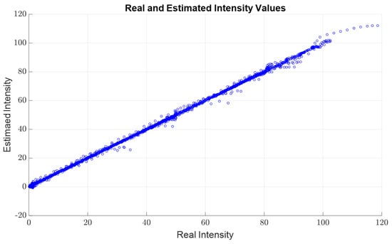 As observed in the results, the predicted intensity values from the model exhibit a high level of agreement with the actual intensity values. The accuracy rates presented in Table 6 are consistently above 98%, demonstrating that the model performs reliably across different distances, angles, and surface types.