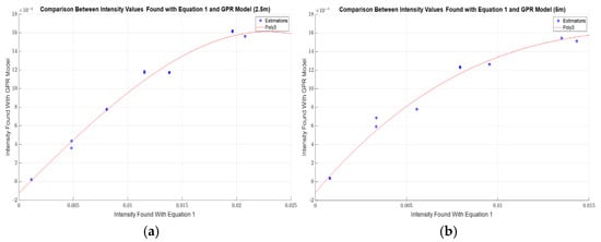 First, the curve fitting process was conducted for a distance of 2.5 m. Figure 9 illustrates the curve fitting plots for 2.5 m and 5 m, depicting the relationship between Equation (1) and the intensity values predicted by the GPR model. In the figure, the red curve represents the third-degree polynomial (poly3) function used for curve fitting, while the blue dots correspond to the theoretical and experimental intensity values. The coefficients of the derived equations for each distance are presented in Table 4.
