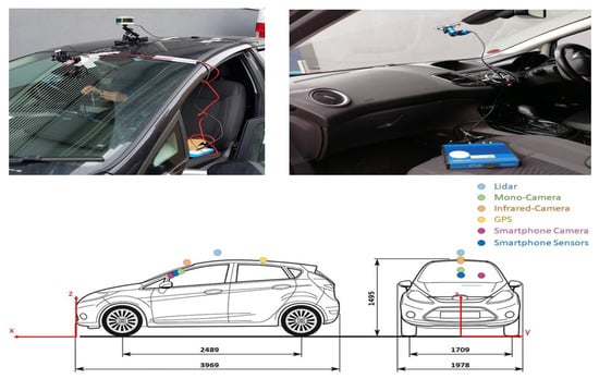 The data collected through monocular, infrared, and smartphone cameras, a LIDAR sensor, GPS receivers, smartphone sensors, and a CAN-Bus data logger integrated into the research vehicle were used to comprehensively analyze the interactions between the vehicle’s environmental perception and real-time responses. The CUPAC dataset was regulated under the General Data Protection Regulation (GDPR) to ensure ethical data processing. Video sequences recorded by the three-camera system were manually scanned for license plates and human faces and labeled using Matlab Ground Truth Labelers. The labeled regions were then blurred using a Gaussian filter. The equipment and sensors used in this study include a Racelogic VBOX video (Buckingham, UK) monocular camera (1920 × 1080 resolution/30 fps), Racelogic VBOX video HD2, CAN-Bus data logger (10 Hz), GPS antenna (10 Hz), Velodyne VLP-16 LIDAR sensor (600 rpm/10 Hz), FLIR One Pro infrared camera (1080 × 1440 resolution/8–9 fps), and Samsung Galaxy S8 camera (1080 × 720 resolution/30 fps). The LIDAR unit, infrared camera, and GPS receiver were mounted outside the research vehicle, while the remaining sensors were positioned inside the vehicle. All these placement details, along with the vehicle dimensions and sensor positions, are shown together in Figure 10. However, the smartphone camera and sensors are not included in the figure.