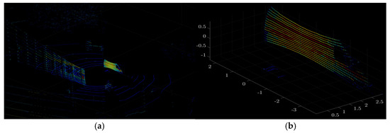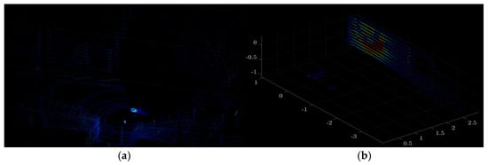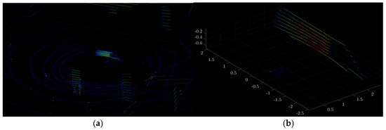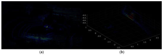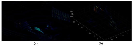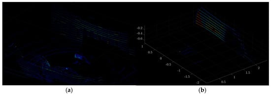 Visualization of the PCD data of the SB-Matte (Black) colored vehicle: (a) before spatial filtering and (b) after spatial filtering.
