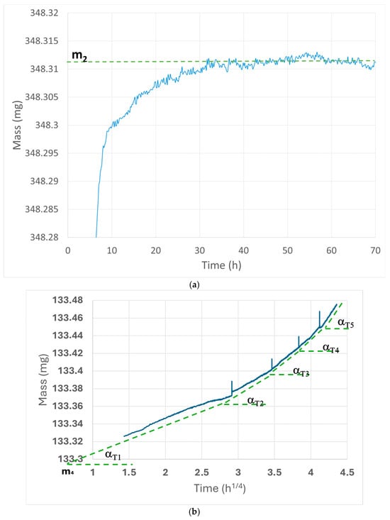 - The samples were placed in the dynamic vapor sorption balance (DVS) at a constant temperature and relative humidity (200 °C, 40% RH). Once the mass variation recorded on the mass vs. time curve reached a value <10−4 mg/min, meaning that there were no more significant changes in the mass loss, the mass vs. time data related to Stage II were used to generate linear regression parameters, with the mass m2 (see Equation (1)) as the intercept and the mass change (negligible) as the slope (Figure 1a).