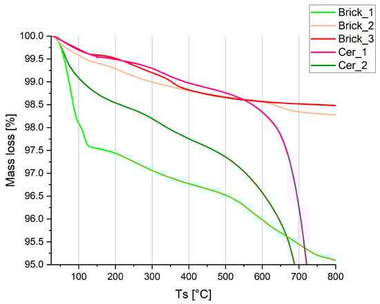 The proposed experimental sequence, with the initial TGA step, allowed for qualitative discrimination of the samples not suitable for analysis by the standard procedure. Figure 2 shows the TGA curves of the five samples, which can be clustered into two groups. In the first group are Brick_2, Brick_3 and Cer_1, which underwent limited weight loss in the TGA curves (mass fraction <1%) in the 100 °C dehydration range and a stepped behavior in the mass loss.
