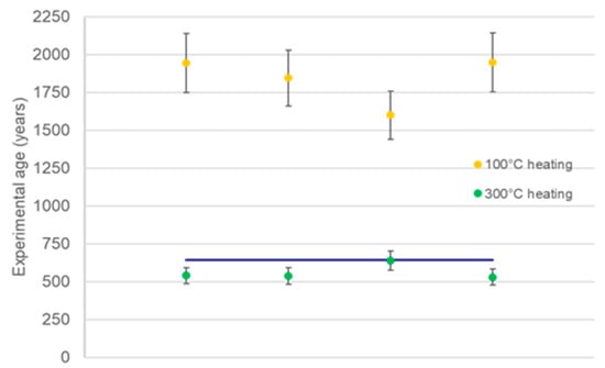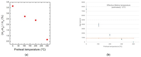 As an example of the effect of the preheating temperature, the results obtained from the Brick_1 sample are reported in Figure 3: the mass difference decreases, and the age estimate is more accurate with preheating in a temperature range between 200 and 300 °C. The discrepancy between experimental and expected ages is due to the continuity of mass loss between 200 and 300 °C, as discussed before: the optimal temperature lies in this interval, but it is not easily determined.