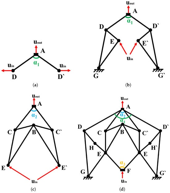 Design procedure of the displacement reducer based on over-constraint: (a) A reducer designed based on triangular mechanical amplifier labeled by ; (b) Added two triangular levers by and ; (c) Internal secondary reduction mechanism constructed on the same principle; (d) The final structure of the combined internal and external displacement reducer.