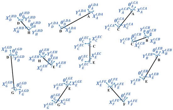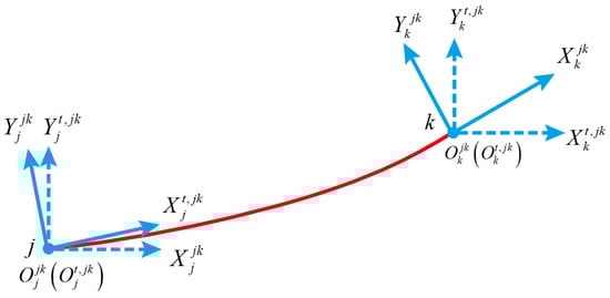 where represents the resultant force acting on the beam at points j and k, represents the resultant displacement generated at points j and k, and represents the stiffness matrix that maps displacement to force. The specific parameters of are calculated by considering the mechanical properties, geometry, and applied loads of the compliant beam. The stiffness matrix used in this paper is referenced from [,]. Vectors , , and can be represented, respectively, by formulas Equations (2)–(4).