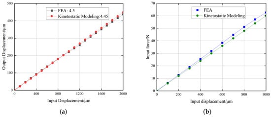 Comparison of the predicted results between the kinetostatic model and FEA: (a) Input and output displacements; (b) The input displacement and the input force.