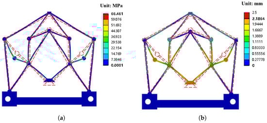 In this study, the FEA simulations were conducted using ANSYS Workbench 2021 R1. In the simulation, the entire mechanism was modeled with large deflection. A tetrahedron elements method was employed, generating a mesh with an element size of 1 mm. The meshing is shown in Figure 5. Boundary conditions and input displacement were set by applying fixed support and displacement in the static structural analysis. Assuming that the reducer is made using printing technology with PLA material, the Young’s modulus E is 3.5 GPa, Poisson’s ratio v is 0.33, and the density is 1.25 g/cm3. Through finite element analysis, the input–output relationship of the displacement reducer was obtained, as shown in Figure 6a. Figure 6b depicts the overlay of the analytical model and the finite element simulation model. The finite element model predicts an average reduction ratio of 4.5, whereas the analytical model calculates an average reduction ratio of 4.45, resulting in a discrepancy of 1.1%. Figure 6b illustrates the relationship between input displacement and input force, with an error of 3%. Figure 7 shows the stress distribution and deformation results of the model under ANSYS Workbench 2021 R1 simulation; the scale of deformation results is 1:1, with the dashed line representing the structure before deformation. The research results indicate that the model exhibits uniform stress distribution and deformation, thereby alleviating the phenomenon of stress concentration.