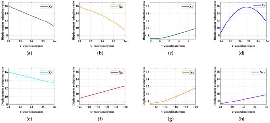 Analysis of the influence of different points in the x−coordinates on the reduction ratio: (a) point A, (b) point B, (c) point C, (d) point D, (e) point F, (f) point G, (g) point H, (h) the relative position of points C and D.