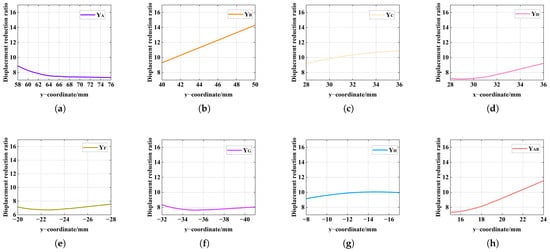 Analysis of the influence of different points in the y−coordinates on the reduction ratio: (a) point A, (b) point B, (c) point C, (d) point D, (e) point F, (f) point G, (g) point H, (h) the relative position of points A and B.