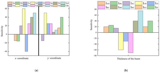 Figure 10 shows the sensitivity of the displacement reducer to different structural parameters. Figure 10a illustrates the impact of the coordinates of each point on the output characteristics of the displacement reducer. It can be seen that the displacement reducer is significantly affected by the geometric position changes of the structure, with the variation in the x−direction having a greater impact than the variation in the y−direction. Similarly, as shown in Figure 10b, the length of the beam also has a substantial effect on the reduction ratio of the structure, especially the changes in − and −, which result in nearly 80%.