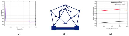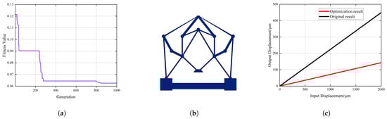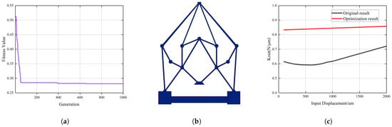 After 1000 generations of iteration, the fitness values are as shown in Figure 12a. The results tend to converge after about 830 iterations, demonstrating the feasibility of the optimization algorithm. Figure 12b shows the structure with constant stiffness in the Y-axis direction after optimization. It can be observed that the slope of the end beams of the overall structure has increased and shows an elongation trend, which is beneficial for displacement reduction. However, excessively long beams may cause large deflection deformations, leading to nonlinear characteristics in the output displacement and output force. This would be detrimental to the load-bearing capacity of the structure and could also reduce the linear output range of the structure. Figure 12c shows a comparison of the output displacement before and after optimization. The reduction ratio prior to optimization was 4.23, whereas, post-optimization, it increased to 16, reflecting an improvement of 378.25%.