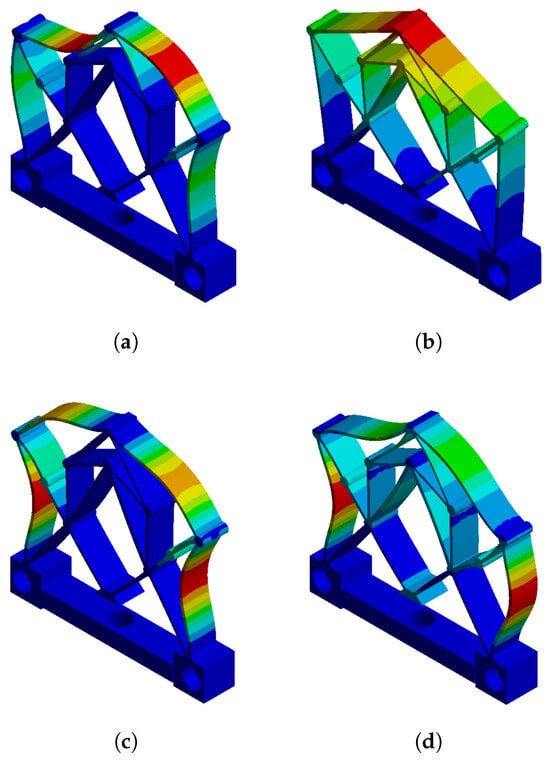 The shapes of the first 4 modes of the displacement reducer: (a) 1st Mode; (b) 2nd Mode; (c) 3rd Mode; (d) 4th Mode.