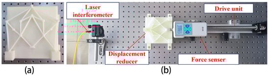 Using the final design results obtained from Section 4, an experimental model of the displacement reducer was fabricated using additive manufacturing technology. The final reducer is shown in Figure 18a. The experimental setup is shown in Figure 18b. In the experimental tests, the FSL40 ball-screw sliding table (Chengdu Fuyu Technology Co., Ltd., Chengdu, China) is used as the actuator for the mechanism to generate input force and displacement. The sliding table provides a continuous thrust of 200 N, with an effective stroke range of 0–500 mm and a repeatability accuracy of 0.05 mm. A laser interferometer (IDS3005, Attocube, Munich, Germany), with a resolution of 1 pm, is employed to measure the displacement of the output mechanism. The force sensor used is the SF-50 digital push–pull force gauge (Airuipu Technology Co., Ltd., Quzhou, China), with a maximum measurement capacity of 50 N and an accuracy of 0.25 N.
