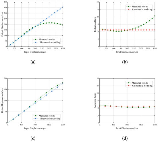 The experimental results of the displacement reducer: (a) The input–output displacement relationship in the range of 0 to 4000 µm; (b) The input–output reduction ratio in the range of 0 to 4000 µm; (c) Zoom in on the image from (a), 0 to 2000 µm; (d) Zoom in on the image from (b), 0 to 2000 µm.