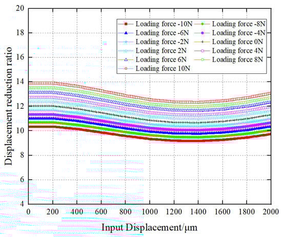 The experimental results were conducted within the load range of −10 N to 10 N at the output end, as shown in Figure 20. The results generally show a constant value with small fluctuations. It can be observed that, within the range of −10 N to 10 N, the variation in load has little effect on the displacement reducer. Increasing the load does not affect the reduction ratio of the displacement reducer. Even at the maximum load of 10 N, the change in reduction ratio does not exceed 16%. This indicates that the displacement reducer maintains a constant reduction ratio over a long stroke and under external load conditions. Additionally, the output stiffness calculated from Figure 21a is 0.7 N/µm.