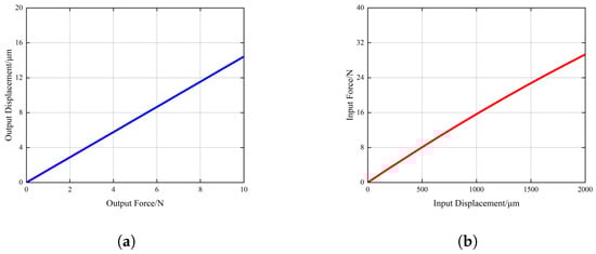 Figure 21b shows the relationship between input displacement and input force obtained from the experiment. The input stiffness of the mechanism is approximately 0.0146 N/µm. Between 0 and 2000 µm, the input stiffness of the mechanism remains approximately constant, which is consistent with the previous optimization objectives. The ratio of output stiffness to input stiffness is approximately 47.94.