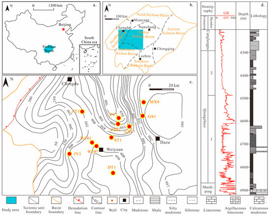 The Sichuan Basin, located in southwestern China, covers an area of approximately 18 × 104 km2 (Figure 1a). It is a large, superimposed petroleum basin developed on a craton and has undergone multiple tectonic movements [18,19,20,21,22]. The basin can be divided into six primary tectonic units (Figure 1b). The Sichuan Basin is rich in petroleum resources, with a proven geological resource reserve of 38.18 × 1012 m3 of natural gas. Among them, conventional gas accounts for approximately 12.47 × 1012 m3, tight gas accounts for approximately 3.98 × 1012 m3, and shale gas at depths shallower than 4500 m accounts for approximately 21.74 × 1012 m3 [23,24]. It is the basin with the richest natural gas resources in China. The Zizhong area is located in the central part of the Sichuan Basin (Figure 1b), and the main body is located in the Deyang–Anyue rift trough. It is currently the primary block for shale gas exploration and development in the Qiongzhusi Formation [25].