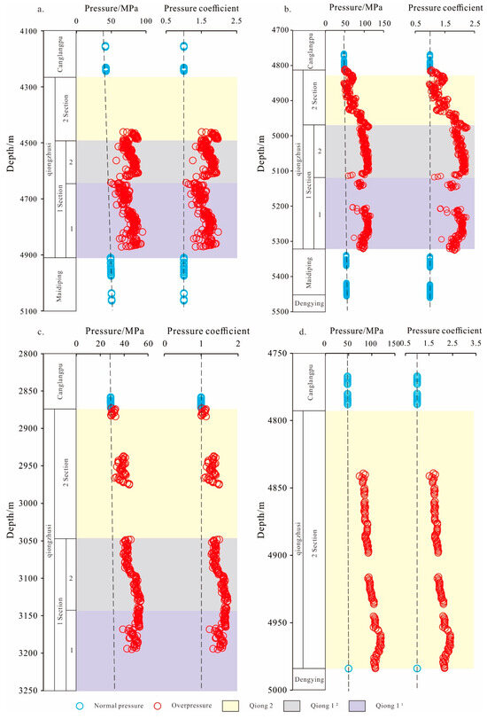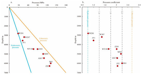 Characteristics of Pressure in the Qiongzhusi Formation: (a) Pressure vs. depth; (b) Pressure coefficient vs. depth.