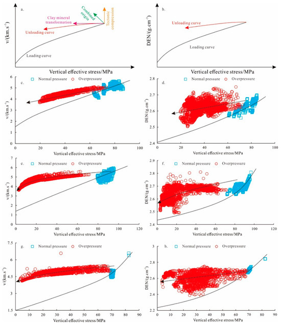 Overpressure identification chart and overpressure cause identification of Qiongzhusi Formation: (a) resistivity–density plate; (b) sonic velocity–density plate; (c,d) overpressure cause identification of Z201; (e,f) overpressure cause identification of GS17; (g,h) overpressure cause identification of WY1H.