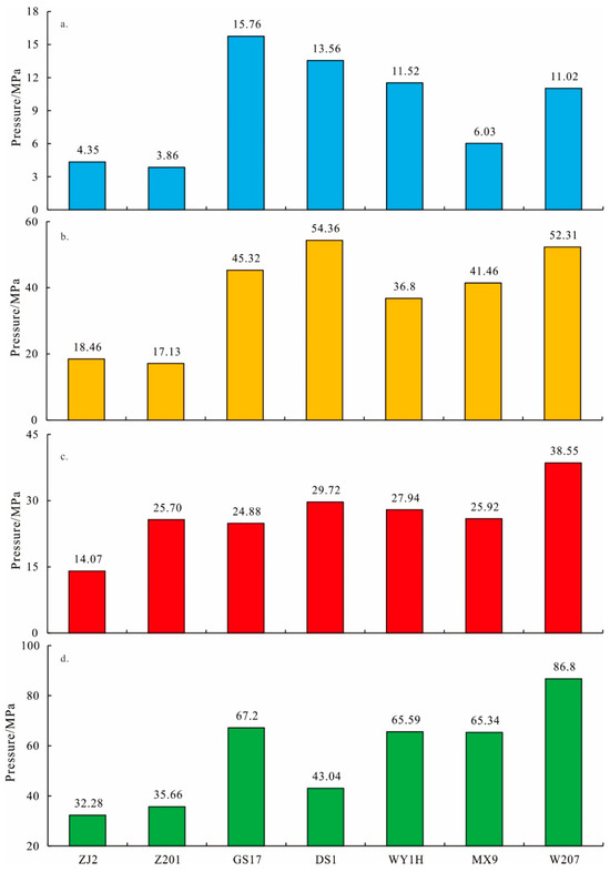 Previous studies have indicated that the geothermal gradient in the area extending from central Sichuan to southwestern Sichuan was highest during the Early Triassic, ranging from 55 °C/km to 60 °C/km. By the end of the Triassic, this gradient had decreased to between 30 °C/km and 38 °C/km, and at the end of the Early Cretaceous, it further declined to between 21 °C/km and 29 °C/km. Currently, the geothermal gradient is approximately 22 to 26 °C/km [58,59]. In the study area, the Qiongzhusi Formation reached its maximum ancient burial depth by the end of the Early Cretaceous. Based on the geothermal gradient at that time and the current geothermal gradient, the reduction pressure due to the decrease in geothermal temperature was calculated. The results indicated that the pressure reduction caused by the decrease in geothermal temperature ranged from 32.38 MPa to 86.8 MPa, with an average of 56.56 MPa, and the impact of the geothermal decrease on Well W207 was the most significant (Figure 7d, Table 2).