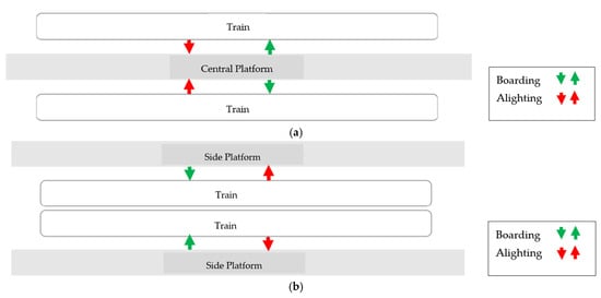 The central platform consists of a single platform that serves two train lines simultaneously. These can either be the same line with services in both directions or a transfer station between two unidirectional services. The train operation takes place on one side of the train, utilizing only 50% of the total doors of each carriage. The platform serves passengers heading in both directions of the train, with a common area that accommodates both groups of passengers, as well as those disembarking from the trains. As a result, four passenger flows converge on the same platform (see Figure 2a).