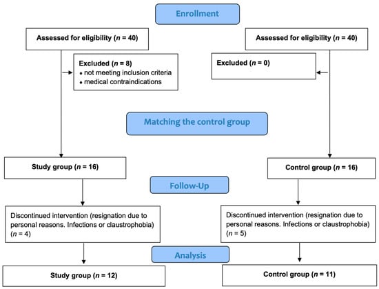 A group of volunteers was recruited for the study, from which normal-weight and overweight or obese subjects were selected [25]. In each group, medical history was taken, and inclusion and exclusion criteria were applied. Study volunteers were grouped according to the indicated criteria in a study group (SG) with a BMI (body mass index) above 27 and a control group (CG) with a BMI within the normal range (18–25). Participants in the study group (SG), consisting of individuals with increased body fat, were matched to the control group (CG) based on age and gender. Ultimately, 23 subjects completed the project (Figure 1).