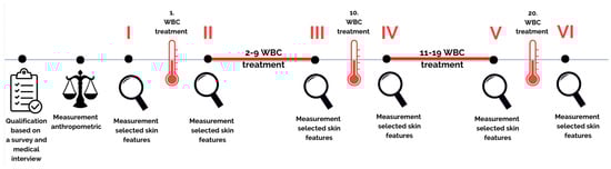 Preparation for the procedure followed standard protocols. Before entering the cryochamber, volunteers were asked to remove jewelry and glasses and to dress in appropriate attire: a cap, a mask covering the nose and mouth, a bathing suit/shorts, gloves, gaiters or long socks covering the tibias and knee joints, and clogs with thick soles. Each WBC procedure included a 30 s acclimatization in the cryochamber atrium (−60 °C), followed by a 3 min treatment in the cryochamber proper (−120 °C). Volunteers walked in a single file, changing direction every 30 s. They exited the cryochamber through its atrium. Immediately after exiting, participants underwent skin characteristics measurements and, in turn, were directed to the training room, where they performed aerobic exercises. Each treatment took place under the supervision of a specialist who monitored its progress through a window built into the cryochamber. Participants were informed that they could leave the cryochamber early if they experienced discomfort.