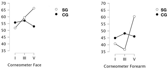 As with skin pH on the face, on the forearm significant differences occurred only for the outcome × group interaction (p = 0.007; ω2 = 0.133). The directions of change for both groups closely resembled what was observed on facial skin. pH in the SG increased significantly in Measure III (difference vs. CG p = 0.011; d = 1.354) and decreased in Measure V (difference vs. III p = 0.005; d = 1.757).