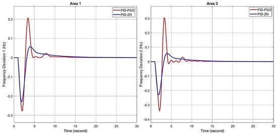 Figure 3). In the graph illustrating the results for area 1, the PID-ZN method shows that at 1 s, when a load disturbance of 0.05 pu is applied, the system frequency drops sharply to approximately −0.23 Hz at 3 s. It then suddenly rises to around 0.05 Hz and, in the subsequent period, the oscillation amplitude gradually decreases. By 18 s, the system frequency is adjusted to a balanced state. Meanwhile, the results of the PID-PSO method indicate that at 1 s, with the same load disturbance of 0.05 pu, the system frequency oscillates with a larger amplitude compared to the PID-ZN method by about 0.04 Hz. However, in terms of settling time, this method enables the system frequency to stabilize faster, achieving a steady state at 14 s. Similarly, for the frequency control results of area 2, the PID-PSO method once again outperforms the PID-ZN method. Although the initial oscillation amplitude is larger by approximately 0.1 Hz, the settling time is shorter, with 13 s compared to 18 s for the PID-ZN method. In both areas, the PID-PSO method demonstrates significantly smaller steady-state errors compared to the PID-ZN method. These results highlight the superiority of the PSO algorithm in optimizing PID parameters, which significantly improves frequency control performance, reduces settling time, and enhances accuracy in both areas (