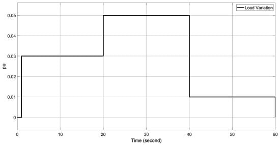Figure 6): from 1 to 20 s, the load gradually ramps up to 0.03 pu, much like the increased demand during peak hours. From 20 to 40 s, it increases to 0.05 pu, representing a period of consistently high demand, similar to heavy industrial usage or increased residential consumption. Finally, from 40 to 60 s, the load abruptly drops to 0.01 pu, illustrating situations where demand suddenly decreases, such as factory shutdowns or demand-side management initiatives. By continuously adjusting the load in this way, the research captures the unpredictable nature of real power systems. Moreover, it thoroughly tests how well the PSO-optimized PID controller can adapt and remain frequency stable under these fluctuating conditions.