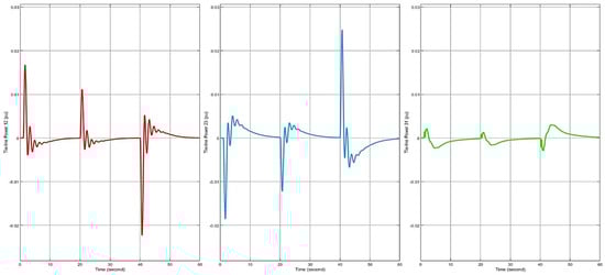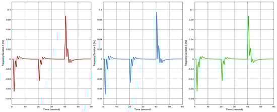 Overall, all three graphs (red, blue, and green) exhibit a similar trend in frequency variation. From 0 to 20 s, they show relatively large frequency fluctuations, with negative deviations ranging from −0.06 to −0.08 Hz, before gradually approaching a stable level (approximately 0 Hz). Moving into the 20–40 s interval, the frequency once again shows signs of fluctuation, this time ranging from about −0.04 to 0.05 Hz, before returning to a near-stable state. During the final 20 s of the simulation, all three graphs display their highest amplitude of frequency deviation, with positive deviations ranging from 0.08 to nearly 0.1 Hz. In summary, all three graphs indicate significant frequency fluctuations under load variations, yet they retain the ability to regulate and bring the frequency back to a stable state.