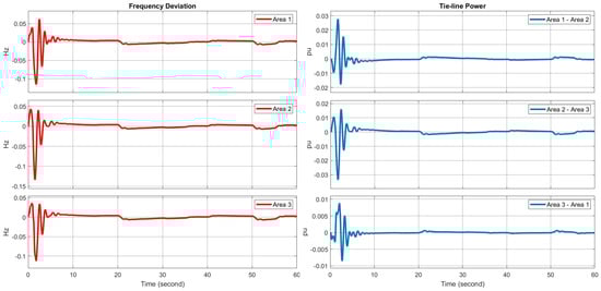 Regarding the tie-line power, during the first 5 s, power exchanges between the areas exhibit strong oscillations, particularly between areas 2 and 3, with an amplitude of approximately −0.032 pu. After t = 10 s, these fluctuations significantly decrease and gradually stabilize. From t = 50 s onward, tie-line power between the areas no longer exhibits major variations and remains stable with an error of less than ±0.002 pu. This demonstrates that the control algorithm has successfully balanced power among the areas, ensuring system stability (