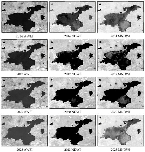 AWEI, NDWI, and MNDWI water index maps in 2014, 2017, 2020 and 2023.