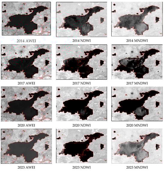 In this study [29], since the independent variables cannot produce reliable results when the Otsu algorithm is used alone, water and non-water places were obtained with very high accuracy using the Canny algorithm. This study presents a method that combines the Canny edge detection technique with Otsu thresholding to accurately determine the surface boundaries of lakes. According to [58], the Otsu algorithm enhances edge detection performance by optimizing Canny’s dual threshold. The initial threshold of 0.7 was determined using this study’s trial and error approach, which involved evaluating several average training samples in GEE. The primary purpose of the initial threshold was to distinguish between water and non-water regions and obtain preliminary water samples. The threshold values calculated for each water index were determined, as shown in Table 1. The optimum threshold values for AWEI were calculated as −0.7821, −0.7207, −0.7204, and −0.8446 for the years 2014, 2017, 2020 and 2023, in the order mentioned. The optimum threshold values for NDWI were calculated as 0.2029, 0.1412, 0.3170, and 0.7809 for the years 2014, 2017, 2020, and 2023, respectively. The optimum threshold values for MNDWI were calculated as 0.0548, 0.0234, 0.0858, and 0.0542 for the years 2014, 2017, 2020, and 2023, respectively. The results can be compared with the advantage that threshold determination is faster and simpler, especially in Lake Van, which has a larger water surface. It gives more stable and accurate results in cases where there are few water pixels and small water bodies [78].