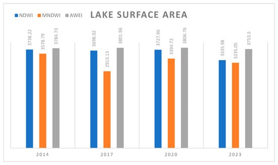Lake surface areas for NDWI, MNDWI, and AWEI water index.