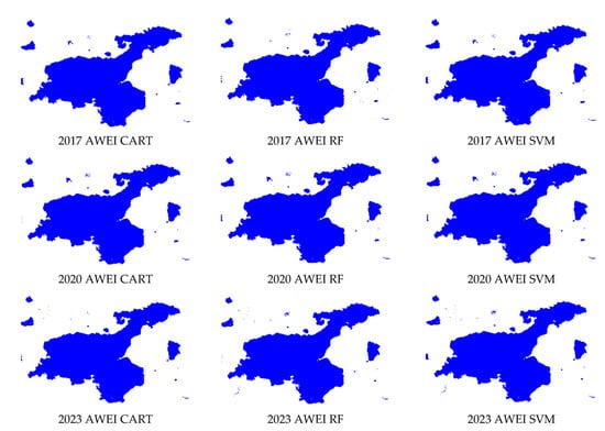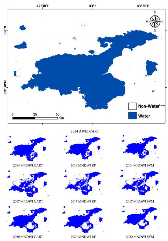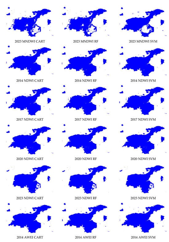 As seen in Table 2, Van Lake surface area pixels were accurately classified by SVM, RF, and CART machine learning algorithms utilized by Landsat 8. The satellite images used in the study were taken between 1 June and 1 September. Producer accuracy, user accuracy, overall accuracy, kappa, and f score accuracy assessment parameters were used to determine the lake surface area. Table 2 provides the accuracy assessment of Lake Van, and Figure 5 presents the lake surfaces obtained according to the water indices used. When compared to other water indices in Lake Van in 2014, the AWEI showed the highest performance with 100%, and the MNDWI showed the lowest performance with 97%, according to the producer accuracy, user accuracy, overall accuracy, kappa, and f score evaluation criteria. According to the accuracy evaluation parameters of 2017, the AWEI showed the highest performance with 100%, and the MNDWI showed the lowest performance with 89%. According to the accuracy evaluation parameters of 2020, the NDWI showed the highest performance with 100%, and the MNDWI showed the lowest performance with 93%. According to the accuracy evaluation parameters of 2023, the AWEI showed the highest performance with 100%, and the MNDWI showed the lowest performance with 90%.